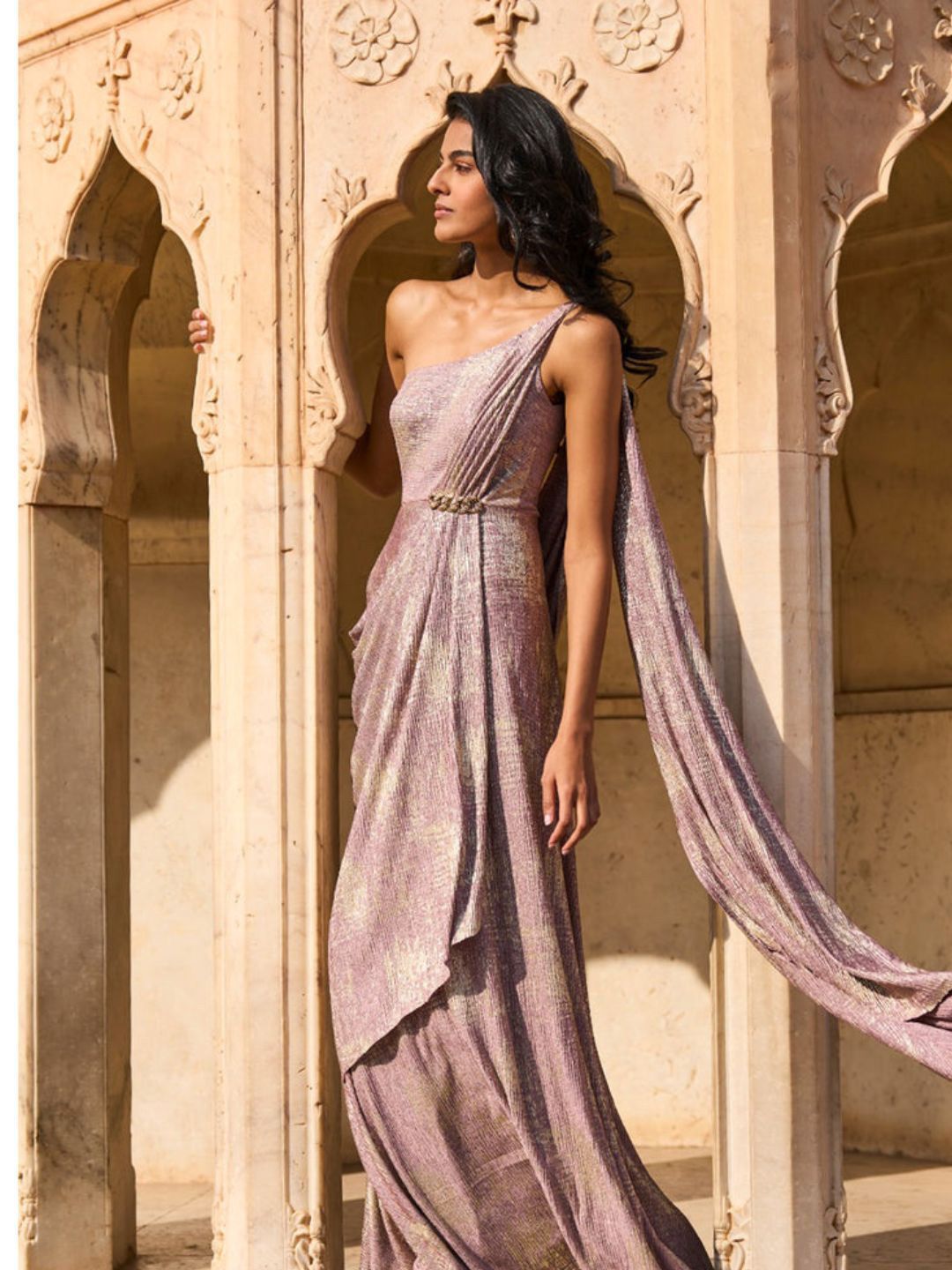 Fit and flare maxi length one-shoulder gown in a shimmering drapey blush and gold knit fabric. Free flowing pleated panel accented with a gold chain detail in the front, which wraps around the waist and over the shoulder in a sari-inspired drape detail. Slit in the side. Zip closure in the side. Garment is fully lined.