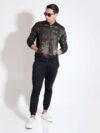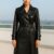 Black solid leather jacket, has a lapel collar, 4 pockets ,has a button closure, long sleeves, straight hemline, polyester lining