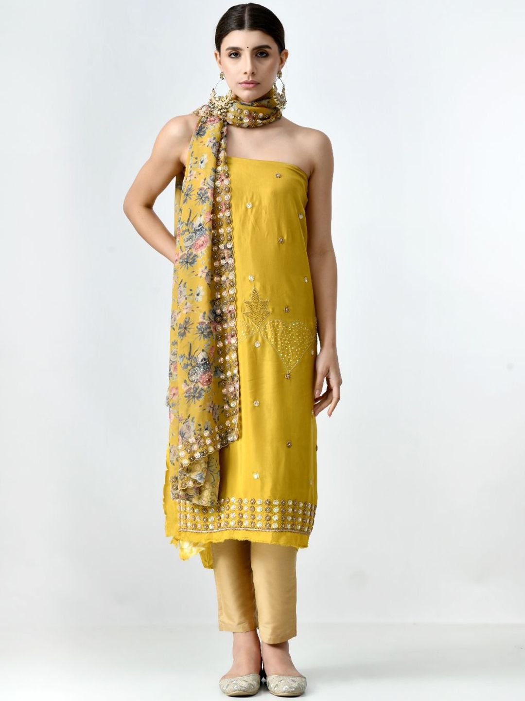 Yellow and gold-toned embroidered unstitched dress material