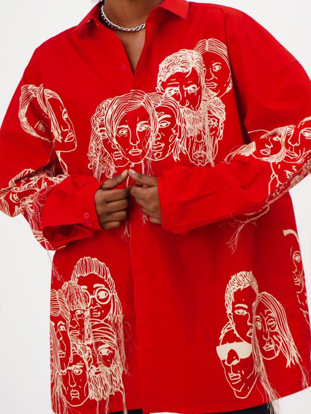 Red graphic printed opaque Casual shirt ,has a cutaway collar, button placket, na patch pocket, long regular sleeves, straight hem