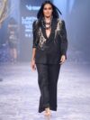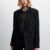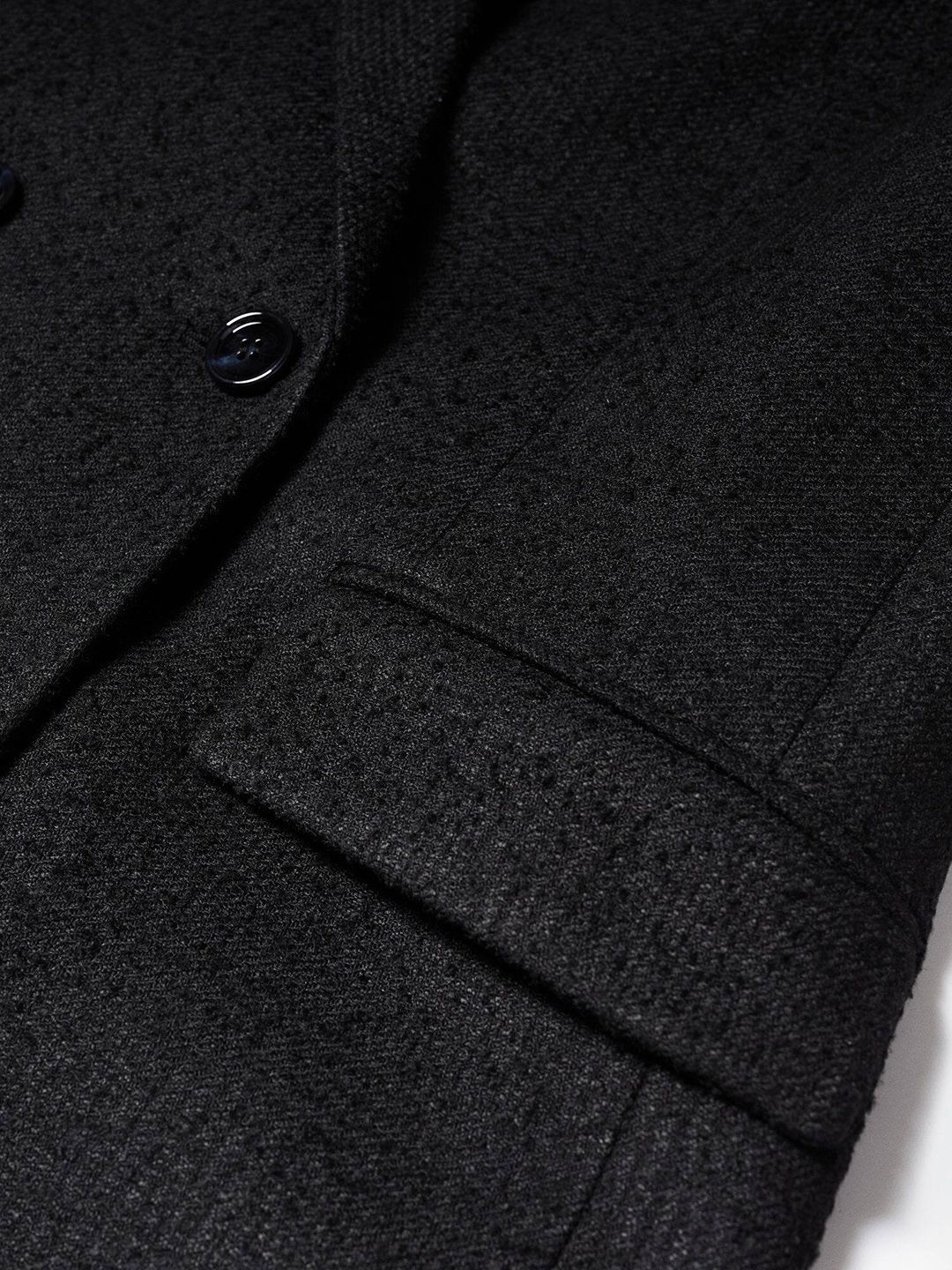 Black patterned longline double-breasted blazer, has a notched lapel collar, button closure, long sleeves, 2 pockets, and an attached lining