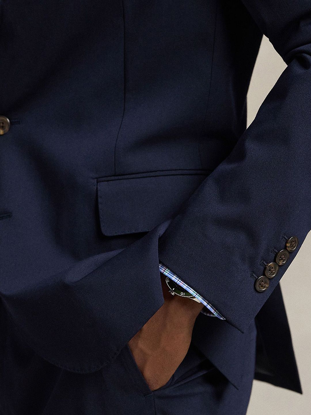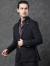 Navy blue solid regular fit blazer, has notched lapel collar, long regular sleeves, 3 pockets, button closure, single breasted