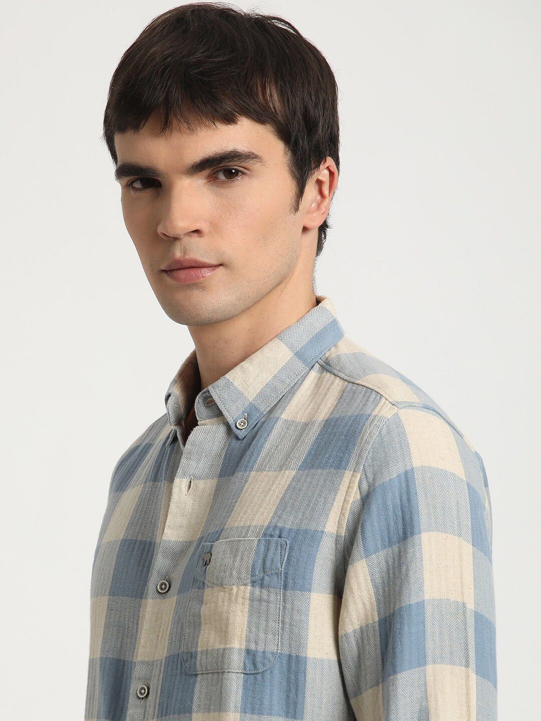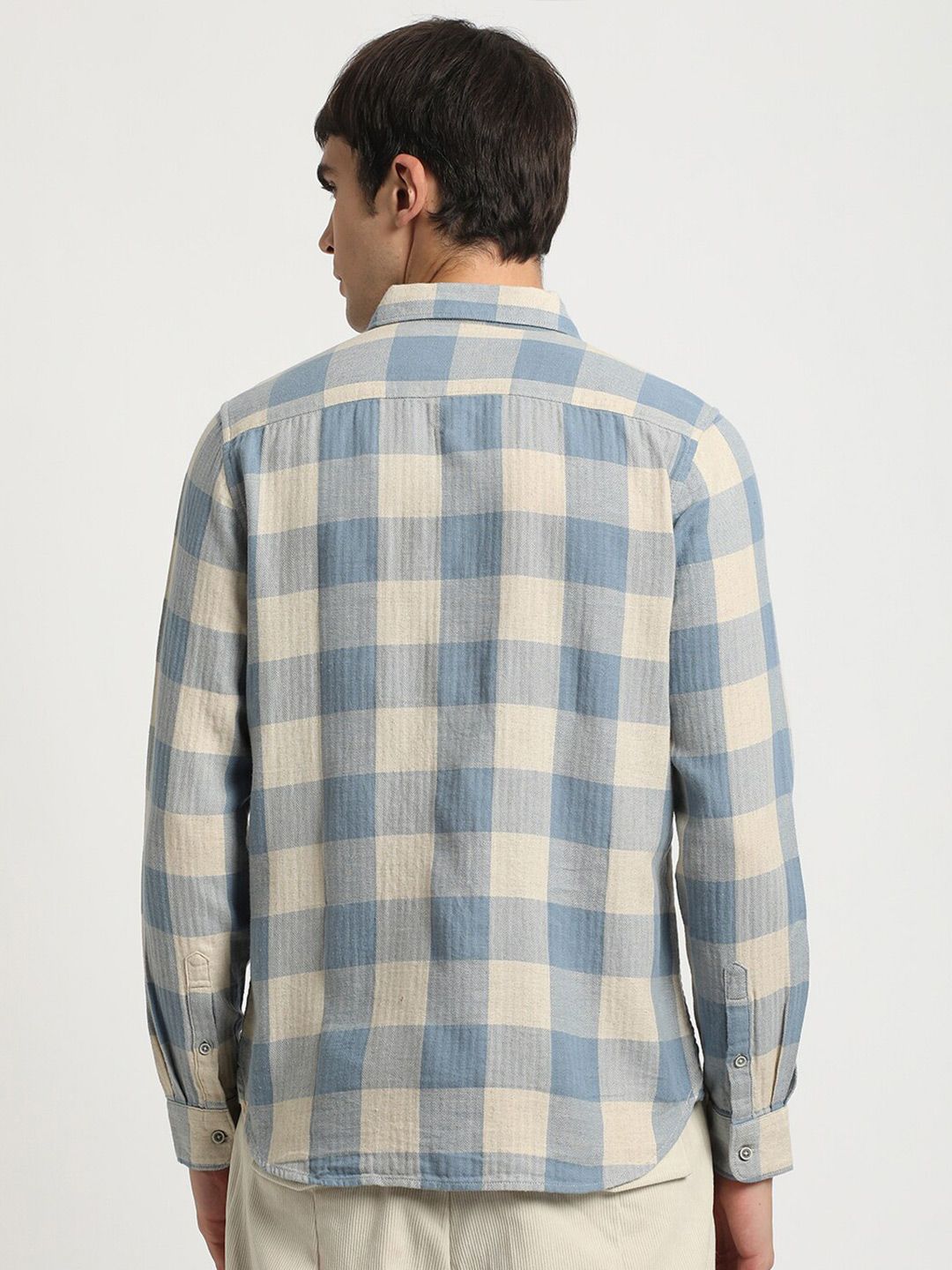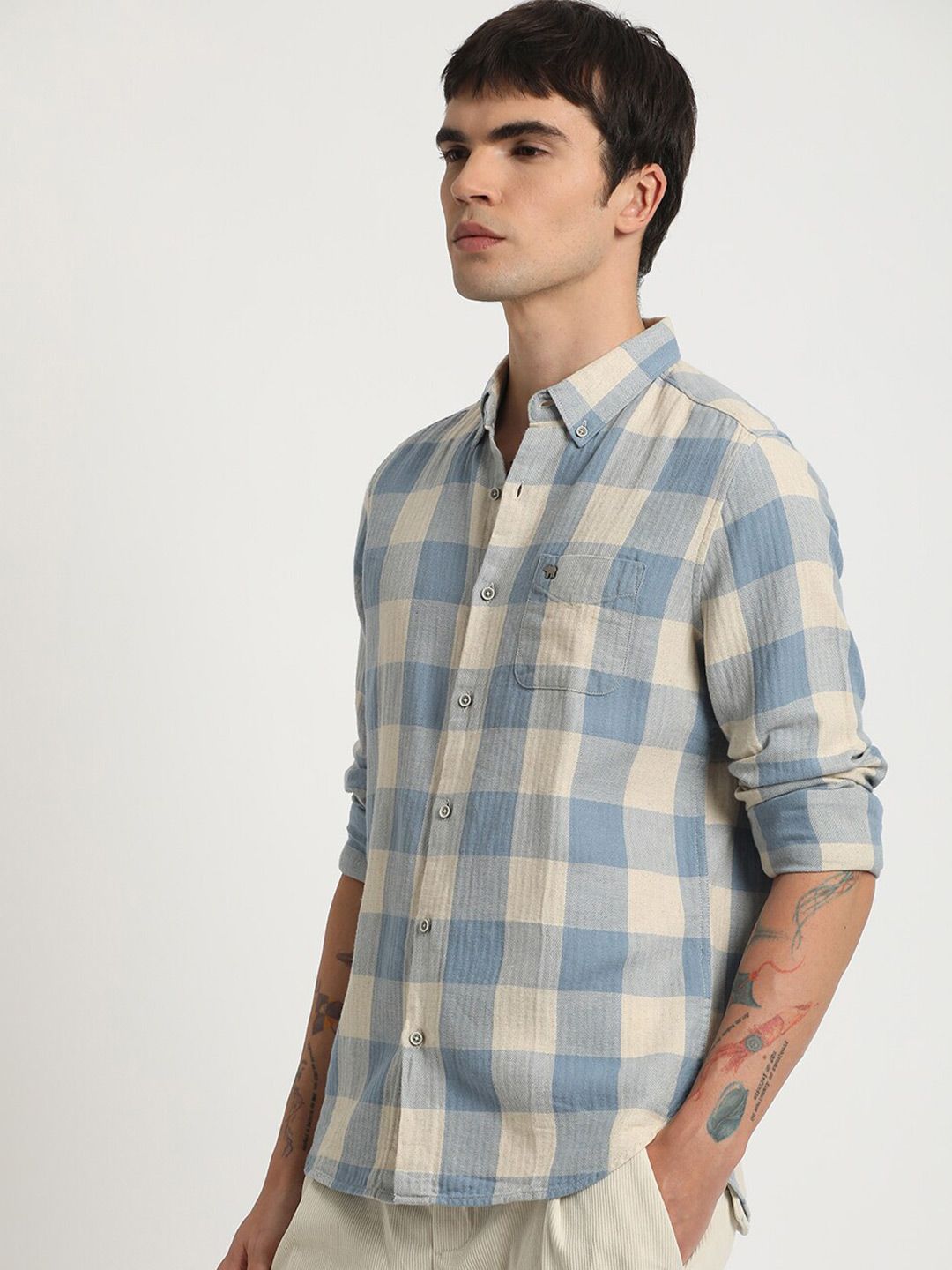 Blue & cream windowpane checked casual shirt, has a button-down collar, button placket, 1 patch pocket, long, curved hem