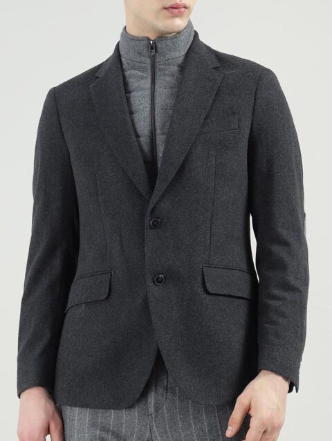 Charcoal and grey solid slim-fit casual blazer, has a notched lapel, long patch sleeves, single-breasted with double button closure, two flap pockets, one welt pocket and a double-vented back hem