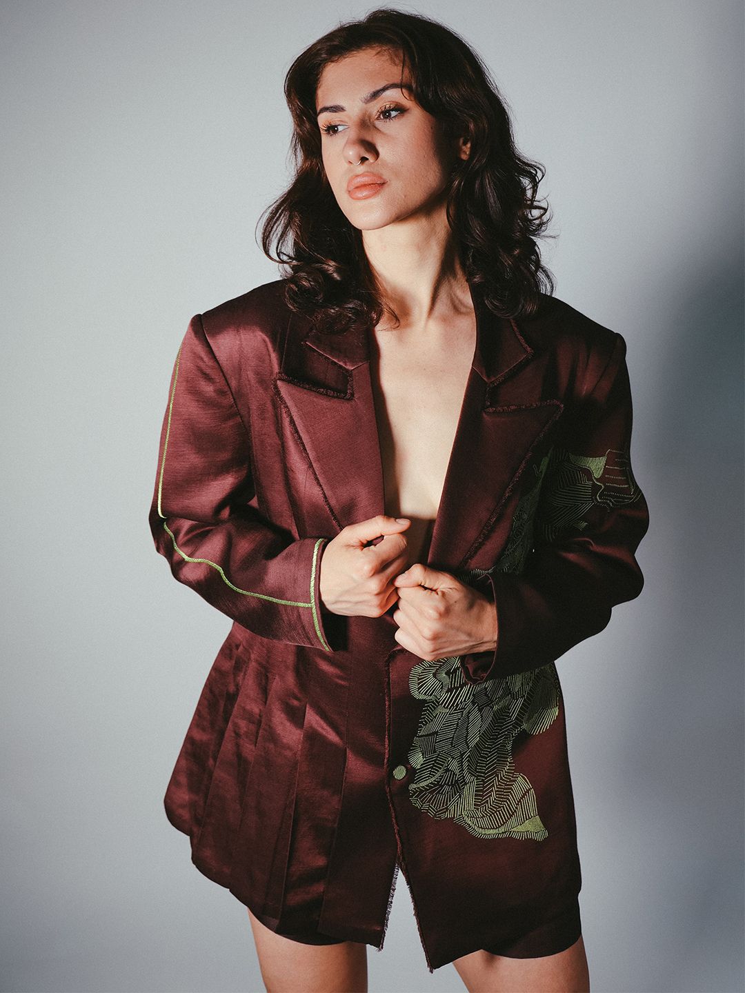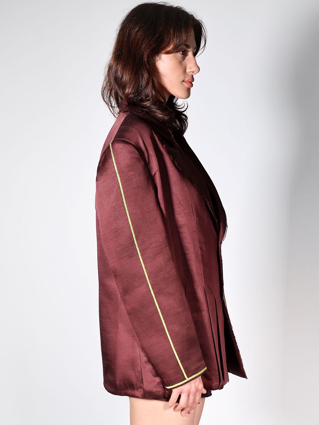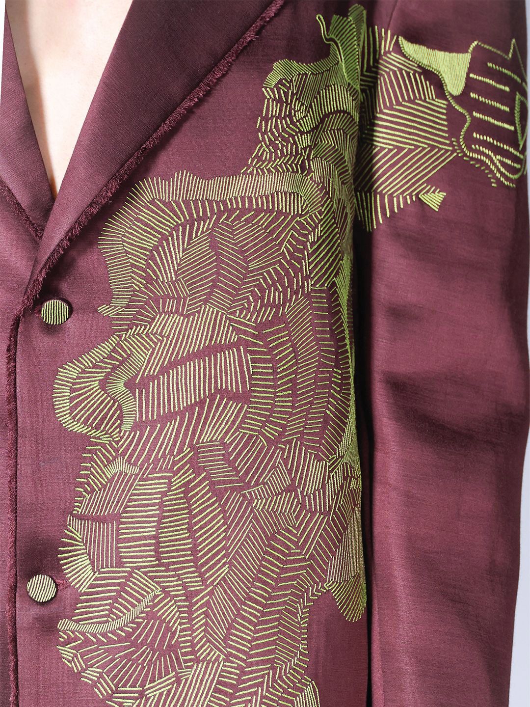 Maroon and lime green embroidered comfort-fit casual blazer, has a notched lapel, long sleeves, single-breasted with double button closure, and a ventless hem