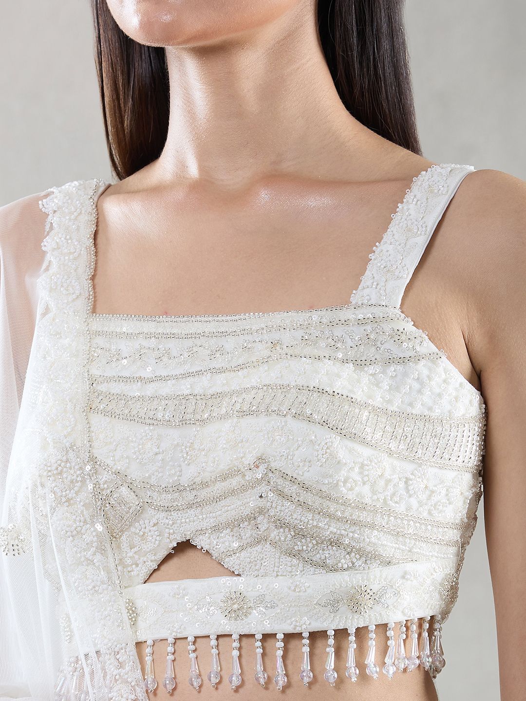 White embroidered lehenga choli with dupatta, has block print technique and beads and stones