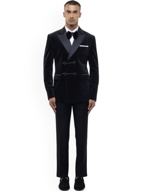 Black solid doubled-breasted blazer, has a peaked collar, long sleeves, button placket, one welt pocket & two flap pockets & three inner pockets