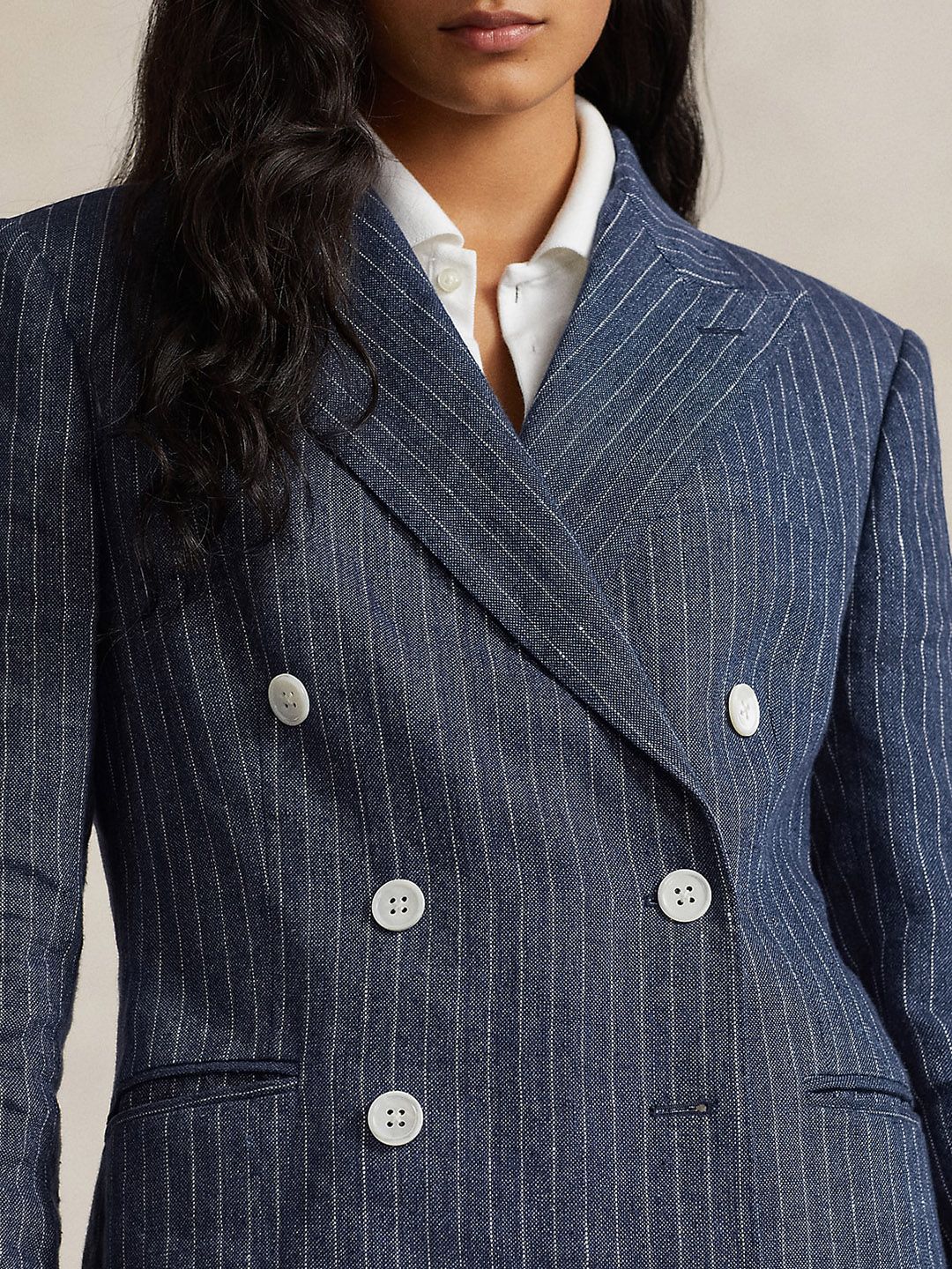 Striped Pure Linen Slim Fit Double Breasted Casual Blazer