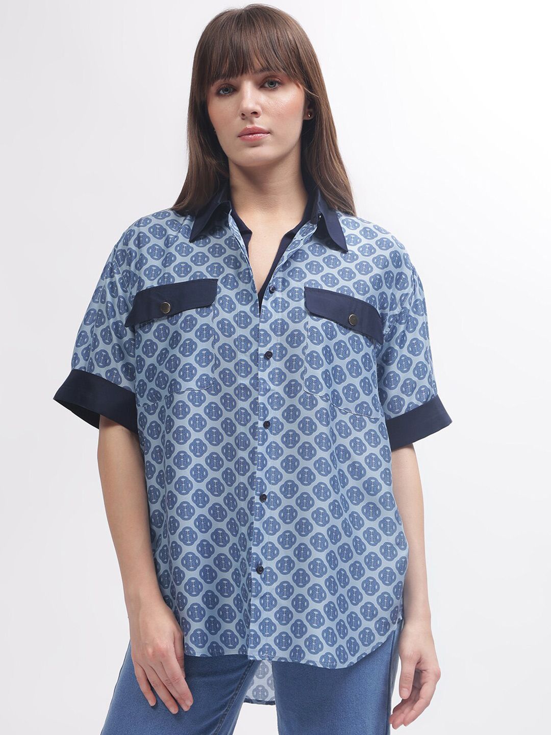 Blue ethnic motifs printed opaque casual shirt ,has a spread collar, button placket, 2 flap pocket, short regular sleeves, curved hem