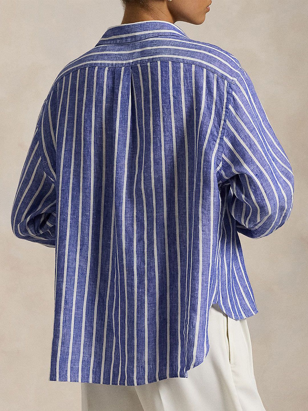 Women Relaxed Fit Spread Collar Vertical Striped Linen Casual Shirt