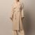 Beige solid slim-fit double-breasted trench coat, has notched collar, long sleeves, button closure, two pockets, a straight hem